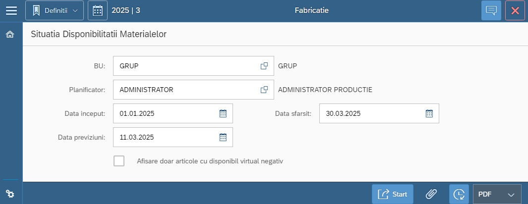 Observatie: Situatia Disponibilului Materialelor nu poate fi lansata in executie la un moment dat de mai multi utilizatori (nu poate fi executata in paralel de mai multi utilizatori).